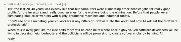 也有网友认为,亚马逊的裁员只不过是一个缩影。随着技术的发展,这种情况将越来越常见,过去二三十年的情况也如此,只不过彼时是用计算机取代了其他人的工作,再早之前,人们是用高效的机器和工业机器人取代蓝领工人。「软件已经吞噬了世界,现在 AI 也将吞噬 “软件专业人士”……」